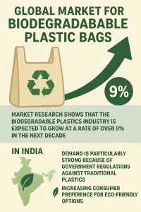The global market for biodegradable plastic bags has been growing quickly due to rising bans on single-use plastics. Market research shows that the biodegradable plastics industry is expected to grow at a rate of over 9 percent in the next decade. In India, the demand is particularly strong because of government regulations against traditional plastics and increasing consumer preference for eco-friendly options.