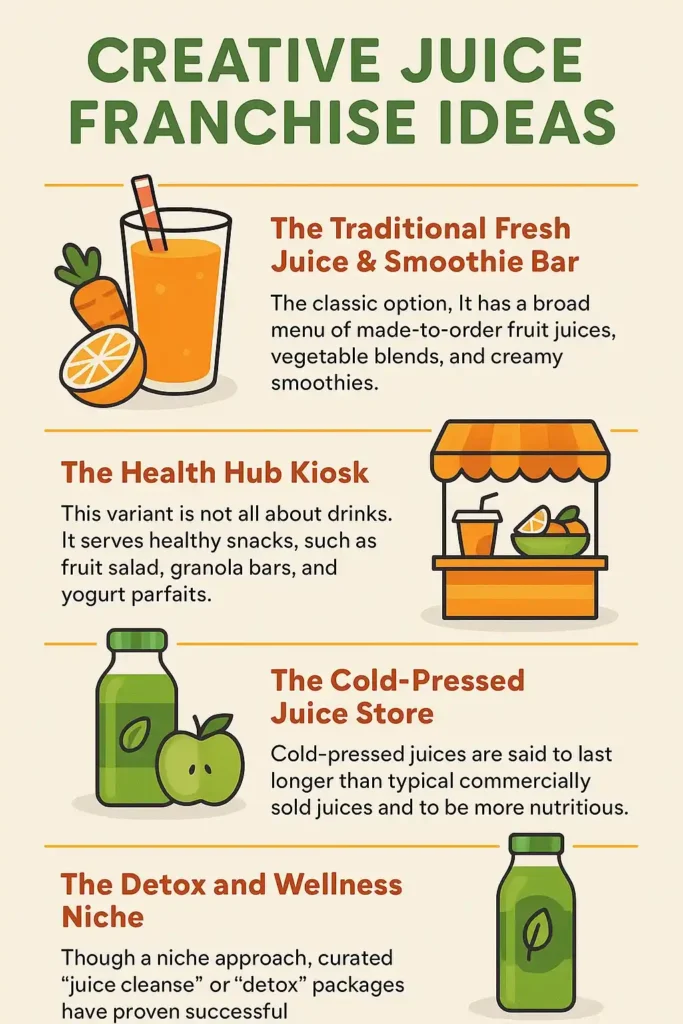 So the world of juice is not just orange and pineapple. The current new Juice Franchise has added some cool ideas to attract more customers. The following are some models you can look at: