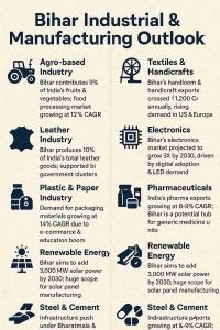 Bihar offers immense opportunities in agro-based industries, textiles, handicrafts, leather, food processing, solar panel manufacturing, and steel production. These sectors benefit from the state’s fertile soil, skilled workforce, and improving infrastructure.